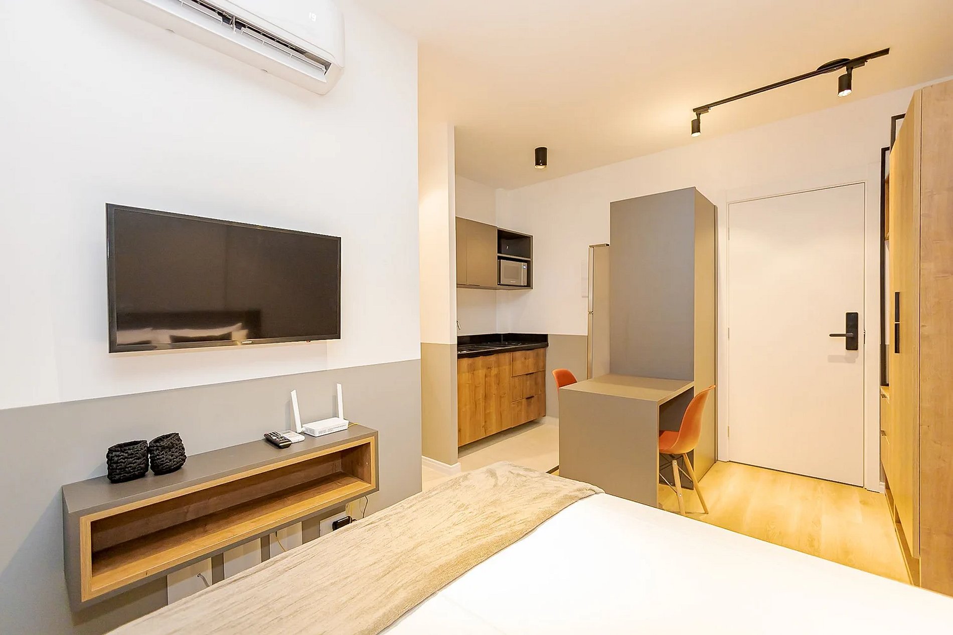 Este estúdio é moderno e compacto, com móveis planejados e acabamentos planejado. A cozinha é equipada com fogão, geladeira, micro-ondas e armários, otimizada para praticidade. O ambiente tem iluminação natural, com grandes janelas que proporcionam luz durante o dia. O prédio oferece um solário com vista e uma academia equipada, além de estar próximo ao Parque Barigui, ideal para quem busca conforto, lazer e praticidade no coração de Curitiba.